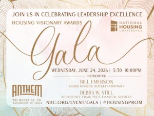 On Wednesday, June 24, 2026, NHC will host our Annual Housing Visionary Awards Gala at the Anthem in Washington, D.C.! Housers from across the country will come together to celebrate the leadership excellence of this year’s honorees: Bill Emerson, Board Member, Rocket Companies, and Debra W. Still, Retired Vice Chair, Pulte Financial Services.