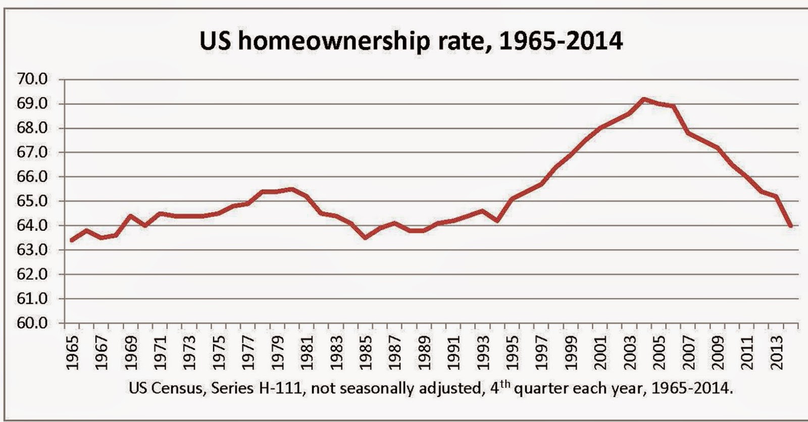 For a recent talk I did at a Women in Housing and Finance conference, I put together two charts of the same data. Here’s the first one, of the homeownership rate as measured by the Census Bureau annually, in essentially the default graph that you can generate from the Commerce Department website. It illustrates the boom and bust focus: