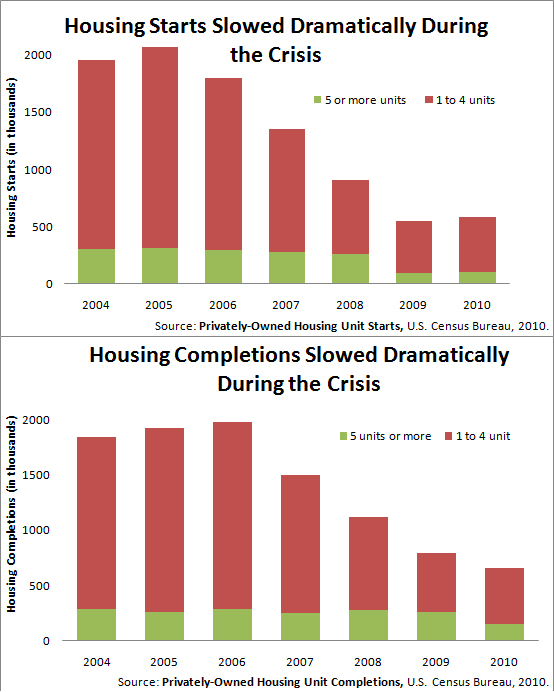 Overall housing activity slowed down dramatically during Great Recession, as one can see from data on housing starts and housing completions: